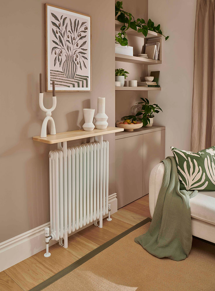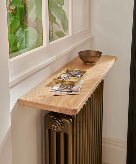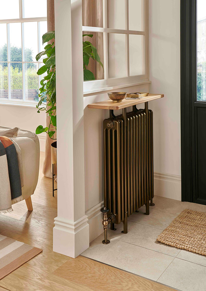 The Ancona Console Table stands at 971mm high and is available in three or four column configurations. Produced in 60 different colours, there is also a choice of three solid timber tops, including Ash, Oak and Walnut and a range of different widths to suit varying heat output requirements. White radiators with Ash tops are available from stock, Oak and Walnut tops as well as painted finishes are made to order.