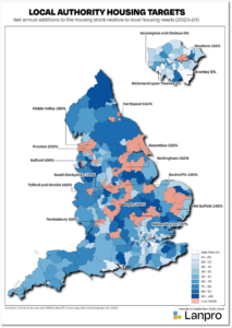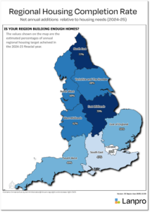 Lanpro’s new mapping shows a starkly uneven picture. The South East and London, where housing need is most acute, are also the furthest from meeting targets – achieving just 47 per cent and 35 per cent of their estimated requirements in 2024–25. By contrast, parts of the East Midlands (79 per cent) and North East (77 per cent) are closer to keeping pace.