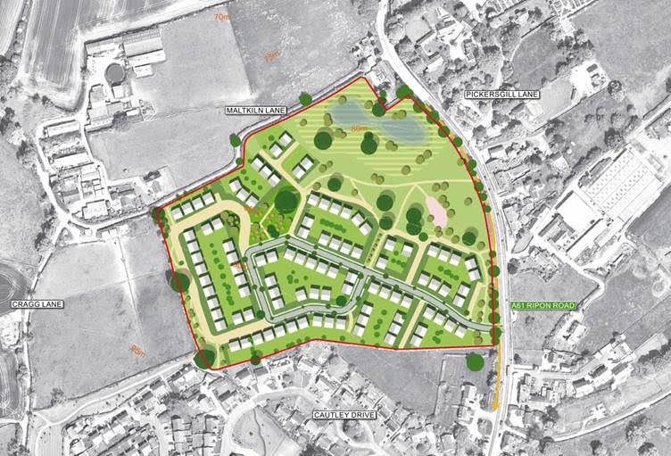 The planning application is for a 16-acre site to the west of Ripon Road, on the northern edge of the village. It includes a large new area of public open space, which would be accessible to residents and the wider community, alongside wildlife areas.