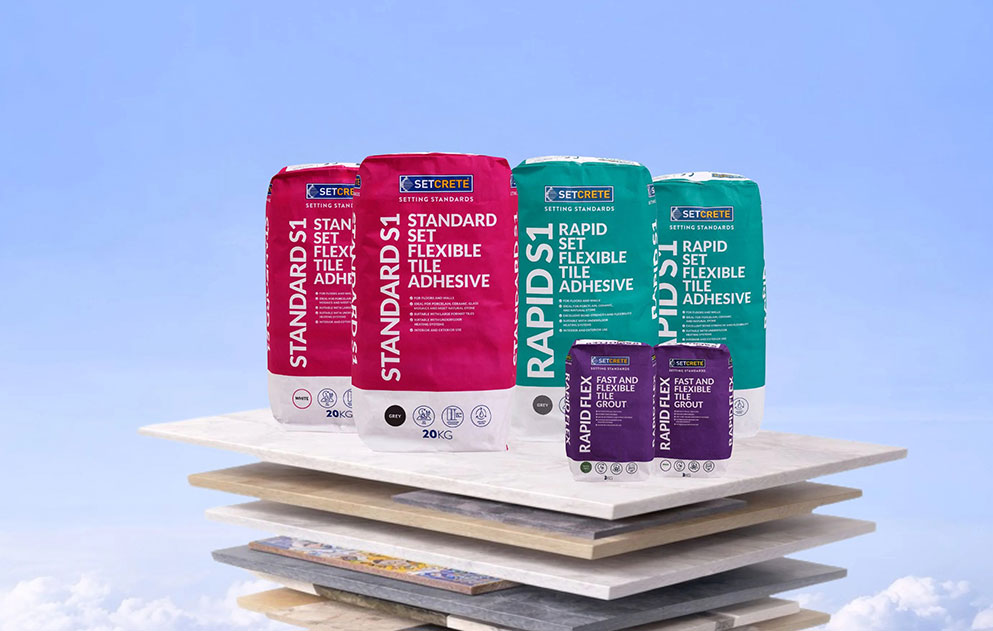 Setcrete tile adhesives are supplied in 20 kg sacks, with grouts available in 3 kg packs.