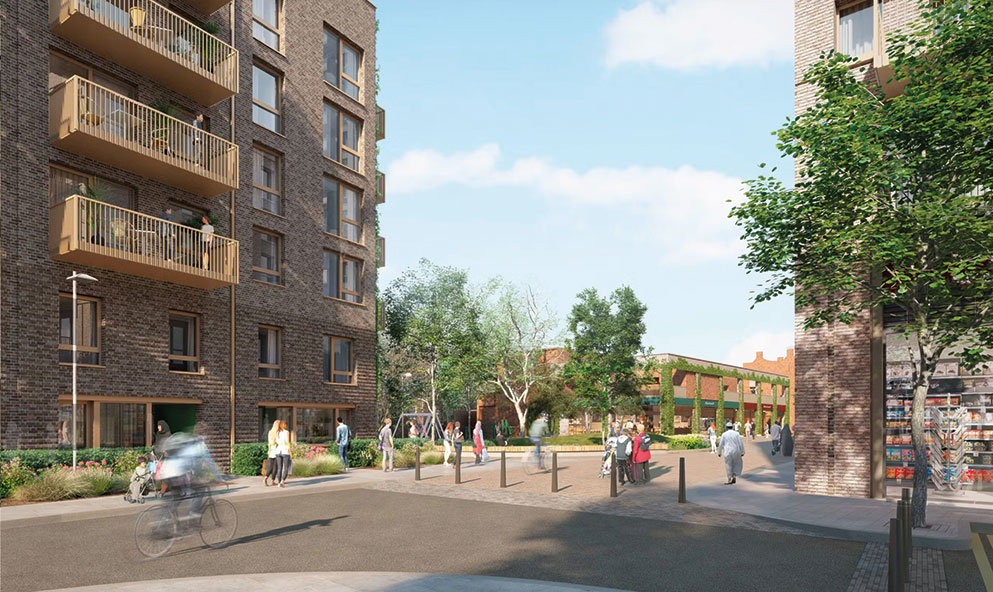 The scheme’s architects undertook a detailed urban analysis to identify exactly what sort of configuration would work best for the area. Ultimately, they concluded that the site lent itself to one tall building to mark the neighbourhood centre, so the plans included a 25 storey tower. This is surrounded by various lower buildings, in a composition of forms which, say the architects, “mend the streets,” together with the improvements made generally to the public realm.