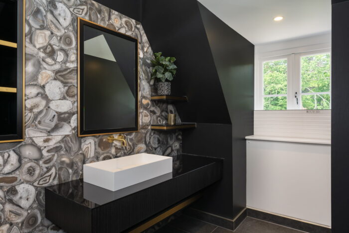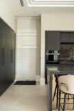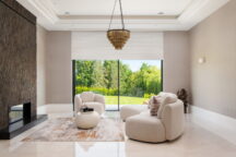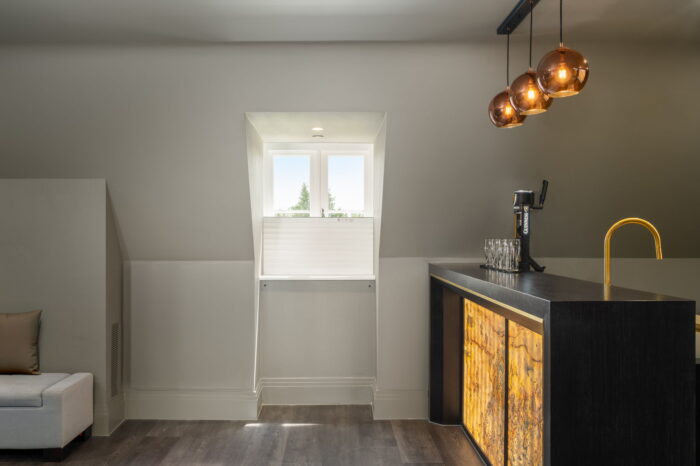 The top floor of one of the homes has an extensive chill-out area with a bar, pool table and big screen for gaming. Although the windows are smaller, being at the top of the house meant that there was no head room for the shutter hood box, so a traditional top-rolling shutter was not possible. However, we were able to install our remarkable ‘vertical-rise’ shutter that rolls from the window-sill upwards. By positioning the hidden hood box at the bottom of the window aperture and boxing it in, this system gives a rather unusual, but absolutely ideal solution.