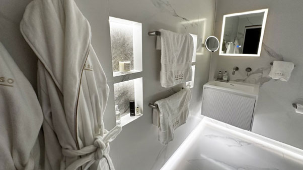 Chris incorporated Schlüter’s modern LED lighting technology with the LIPROTEC system, using prefabricated niches fitted with extra LED strips to illuminate both shelves. He also created a striking effect by running LIPROTEC lighting around the base of the walls.